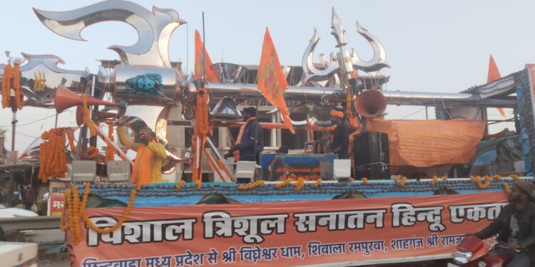 इस अवसर पर भाजपा मंडल अध्यक्ष दिलीप विश्वकर्मा ने बताया कि त्रिशूल यात्रा का मुख्य उद्देश्य देश में सनातन परंपरा को सुदृढ़ करना एवं हिंदू राष्ट्र की स्थापना के संकल्प को जन-जन तक पहुंचाना है। उन्होंने बताया कि यह विशाल त्रिशूल स्टील धातु से निर्मित है, जिसकी लंबाई लगभग 60 फुट है, जिसे देश का सबसे बड़ा त्रिशूल बताया जा रहा है।