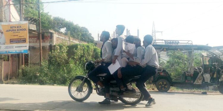 एक मोटरसाइकिल पर दो से अधिक सवारी बैठाना कानूनन अपराध है, लेकिन यहां छः छात्रों का एक साथ बैठना किसी बड़े हादसे को आमंत्रण देने जैसा है। सबसे चौंकाने वाली बात यह रही कि किसी ने भी हेलमेट नहीं पहना था। ऐसे में जरा सी चूक भी गंभीर दुर्घटना में बदल सकती थी।