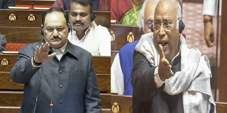 खरगे ने कहा कि संसद दोनों सदनों से चलती है लेकिन सरकार एक सदन को पंगु बनाकर संसद चलाना चाहती है जो देश के लिए धोखा है। उन्होंने पलटवार करते हुए कहा कि प्रधानमंत्री ने सत्तारूढ गठबंधन को बंधक बना रखा है। उन्होंने कहा कि वह लोकसभा में राहुल गांधी को बोलने से रोकने तथा पंडित नेहरू और पूर्व प्रधानमंत्री इंदिरा गांधी के बारे में अशोभनीय बातों की घोर निंदा करते हैं। नड्डा ने आरोप लगाया कि कांग्रेस प्रगति के पथ पर आगे बढ रहे देश के विकास पथ में बाधा खड़ी करने की रणनीति पर काम कर रही है। उन्होंने कहा कि कांग्रेस अपने और एक परिवार के स्वार्थ के एजेन्डे पर काम कर रही है। इस बीच कांग्रेस के सदस्य बीच बीच में नारेबाजी करते रहे और बाद में बहिर्गमन कर गये।