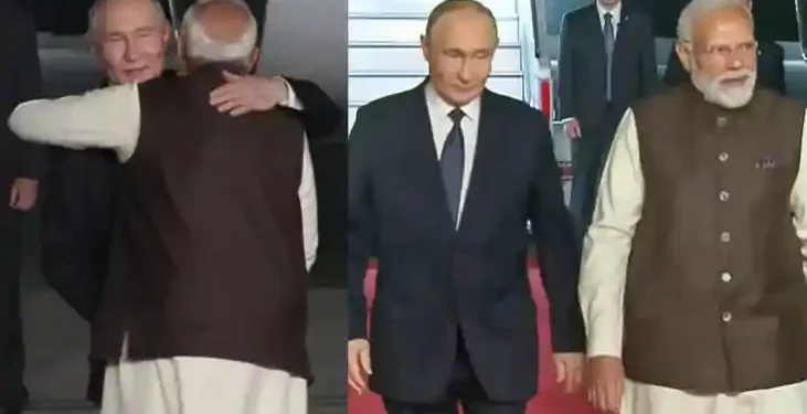 नई दिल्ली,संवाददाता : रूस के राष्ट्रपति व्लादिमीर पुतिन दो दिन की भारत यात्रा पर गुरुवार शाम दिल्ली पहुंच गये। प्रधानमंत्री नरेन्द्र मोदी पुतिन की अगवानी के लिए हवाई अड्डे पर मौजूद थे। उन्होंने गर्मजोशी से पुतिन का स्वागत किया। दोनों नेताओं ने पहले हाथ मिलाया और फिर गले मिले। हवाई अड्डे से दोनों नेता एक की कार में रवाना हुए। इस मौके पर हवाई अड्डे पर ही रूसी राष्ट्रपति के स्वागत के लिए नृत्य का आयोजन किया गया था।