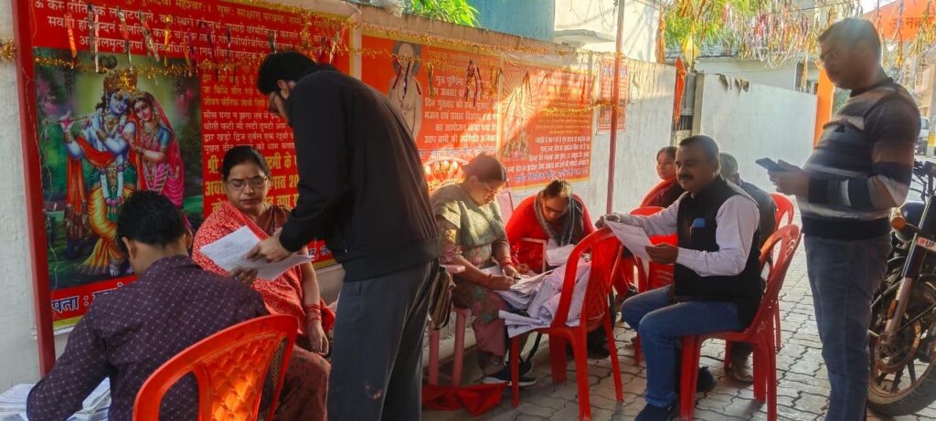 भरतनगर में एसआईआर को लेकर पानी की टंकी के पास फ़ॉर्म भरते बीएलओ व मौजूद पार्षद प्रदीप शुक्ला (टिंकू)